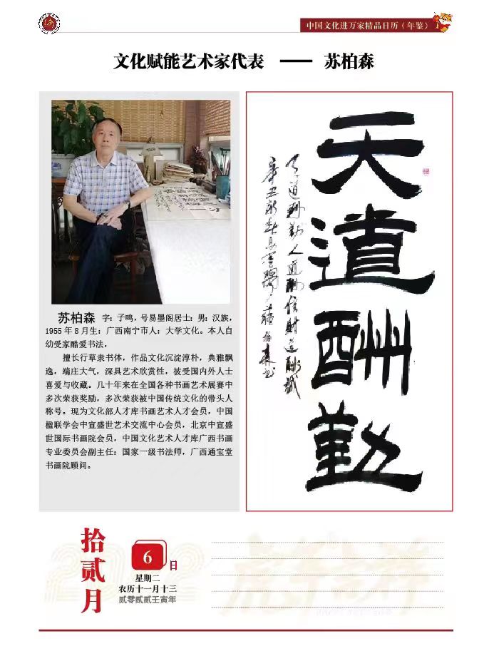 苏柏森,字子鸣,男,1955年8月生,广西南宁人,大学文化,现为中国书法家协会会员、国家一级美术师。